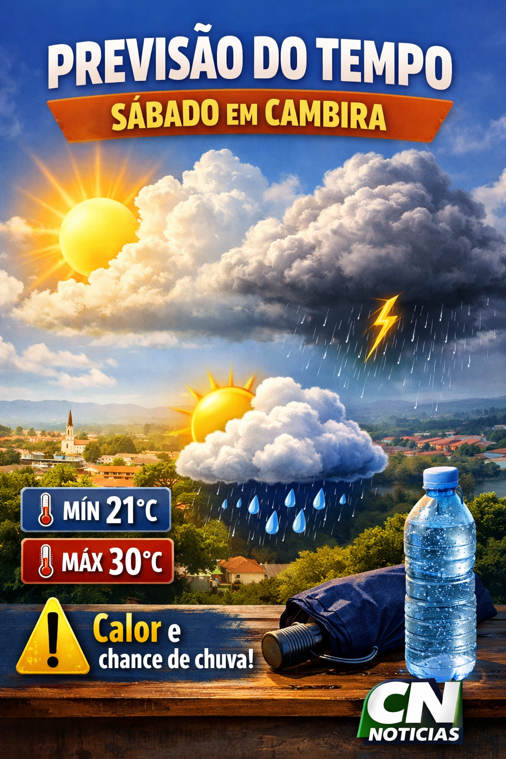 Segundo o site do Simepar, os moradores de Cambira devem se preparar para um sábado de tempo quente e com possibilidade de pancadas de chuva isoladas ao longo do dia.