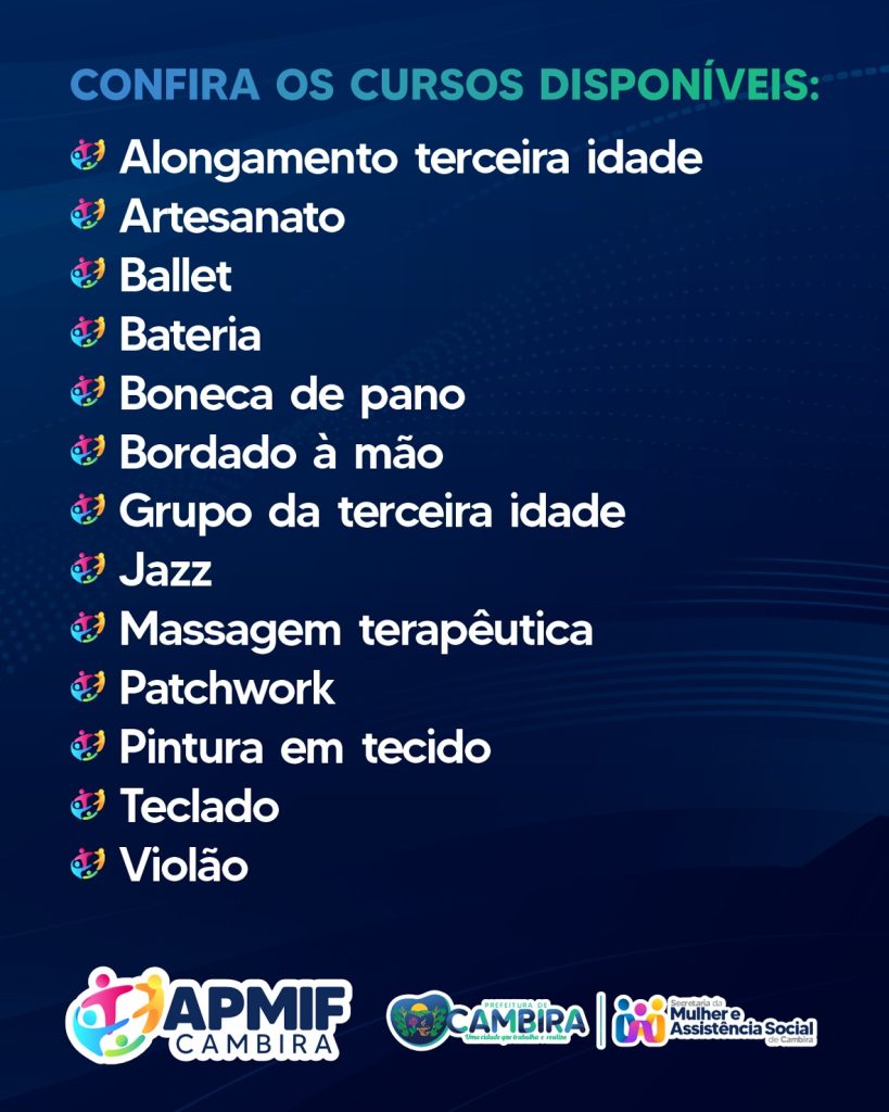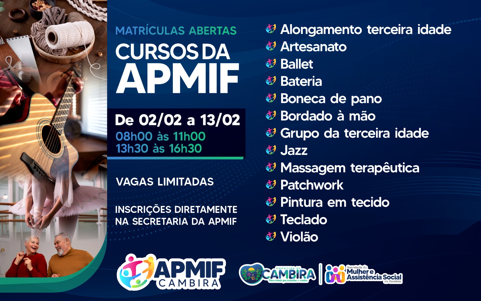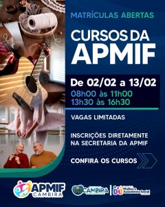 A APMIF de Cambira está com matrículas abertas para diversos cursos gratuitos voltados à comunidade. As inscrições acontecem no período de 02 a 13 de fevereiro, diretamente na Secretaria da APMIF, com vagas limitadas.