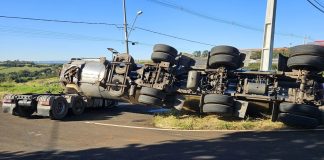 Caminhão carregado com borra vegetal tomba no Contorno Norte de Apucarana