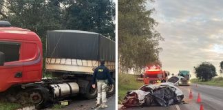 Carro invade pista contrária, bate em carreta com placas de Mandaguari...