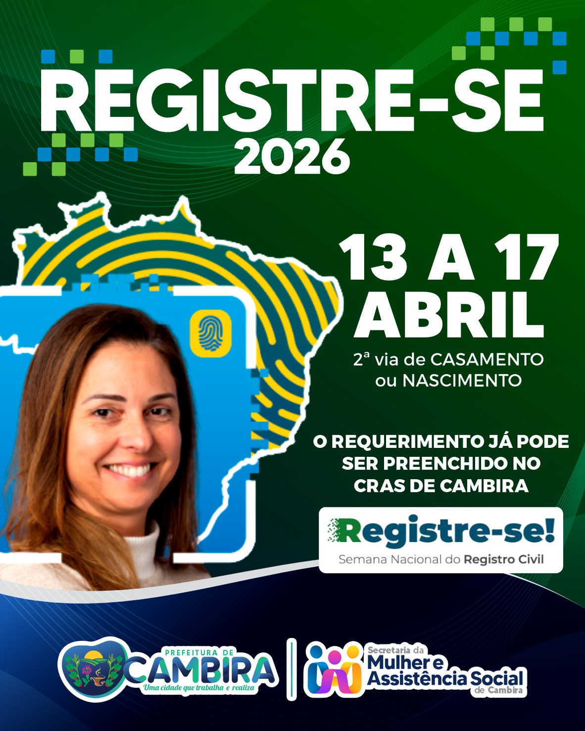A Prefeitura de Cambira aderiu à ação Registre-se 2026 – Semana Nacional do Registro Civil, que será realizada entre os dias 13 e 17 de abril. A iniciativa tem como objetivo ampliar o acesso da população à documentação civil básica, promovendo cidadania e inclusão social.