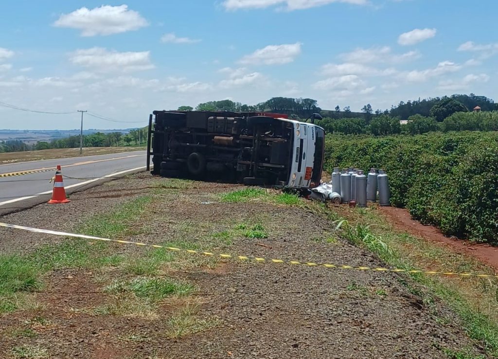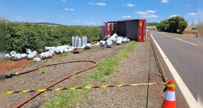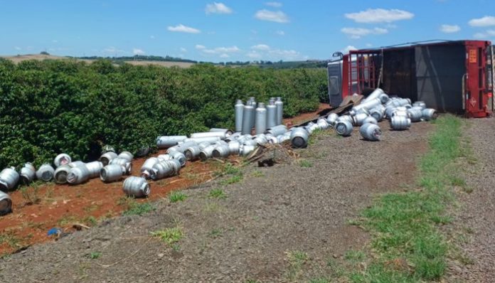 O motorista acabou perdendo o controle do veículo, que transportava dezenas de botijões — a carga ficou espalhada pelo acostamento.