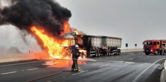 Caminhão carregado de açúcar pega fogo na BR-376, em Jandaia do...