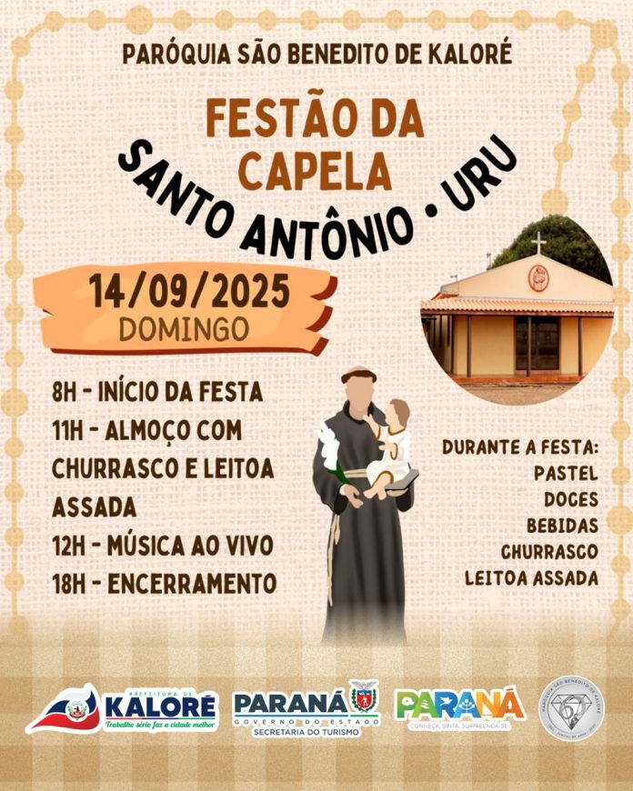 A comunidade da Capela Santo Antônio, localizada no bairro Uru, em Kaloré, realiza no próximo dia 14 de setembro (domingo) o tradicional Festão da Capela, evento que reúne fé, confraternização e cultura local. A programação é organizada pela Paróquia São Benedito, com apoio da Prefeitura de Kaloré e do Governo do Estado do Paraná, por meio da Secretaria de Turismo.