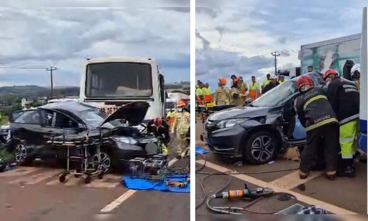 A colisão envolveu dois carros de passeio e um ônibus que transportava trabalhadores. Um homem de 51 anos, condutor de um veículo Honda HR-V, ficou preso às ferragens e precisou ser resgatado pelas equipes de socorro.