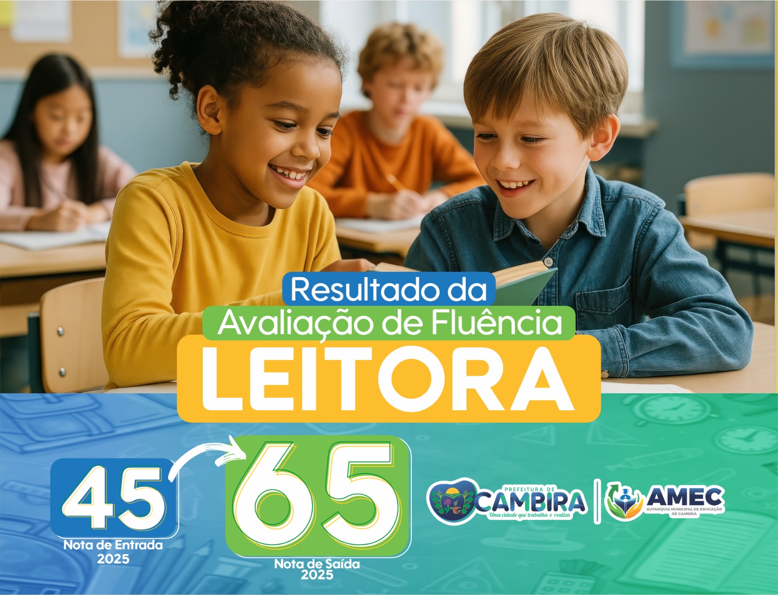 A Educação de Cambira alcançou um resultado inédito na avaliação Fluência Paraná 2025. Os alunos do 2º ano da rede municipal de ensino conquistaram índice 6,5 em Fluência Leitora, demonstrando avanço no processo de alfabetização e consolidando o compromisso do município com a qualidade do ensino nos anos iniciais.