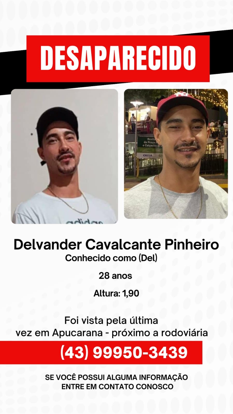A família procura por Delvander Cavalcanti pinheiro (Del), morador da cidade de Cambira, nas proximidades da lanchonete do Porvinha.