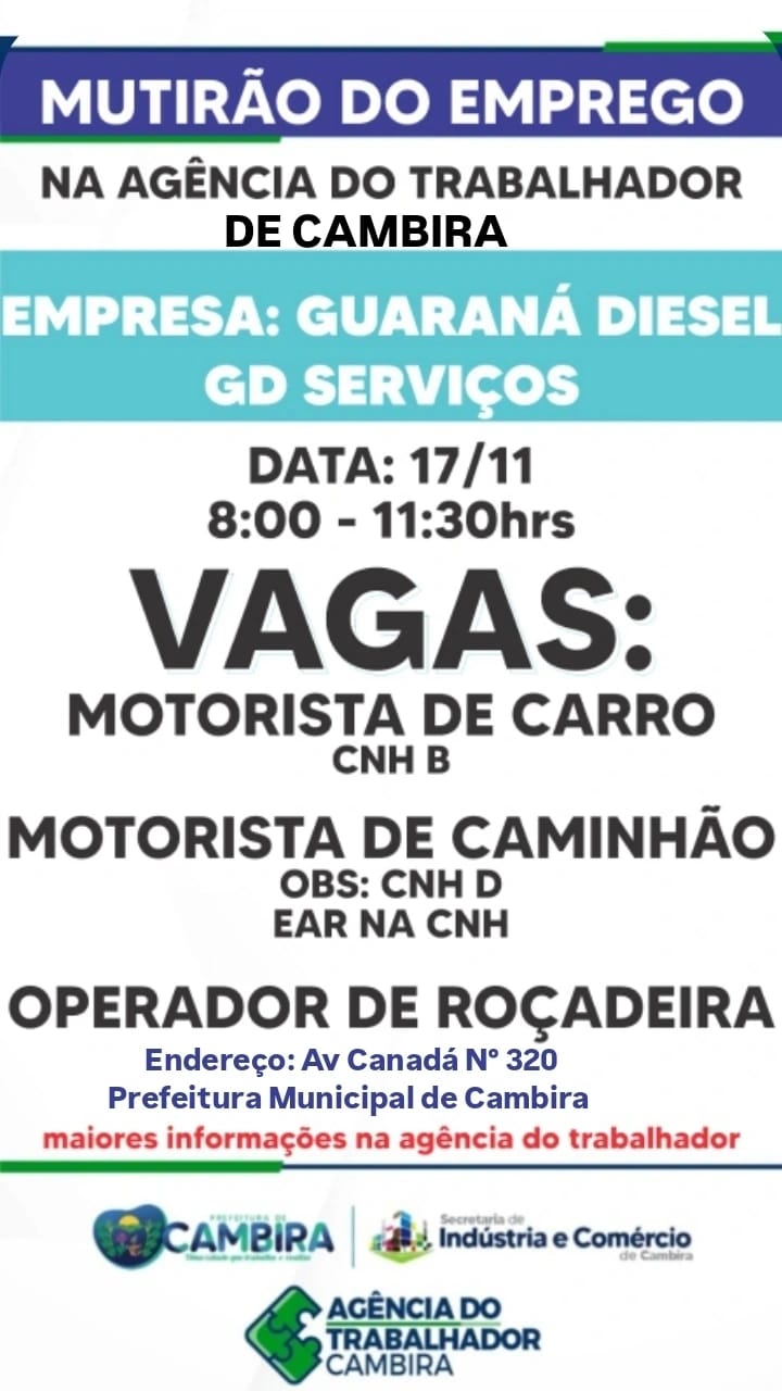 Nesta segunda-feira, dia 17 de novembro, acontece um mutirão de empregos com o pessoal da Guaraná DieseL (GD SERVIÇOS).