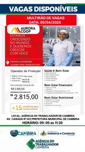 A população de Cambira e região terá uma excelente oportunidade de emprego na próxima semana. A empresa Aurora estará promovendo um mutirão de vagas com salários que podem chegar a até R$ 2.815,00.