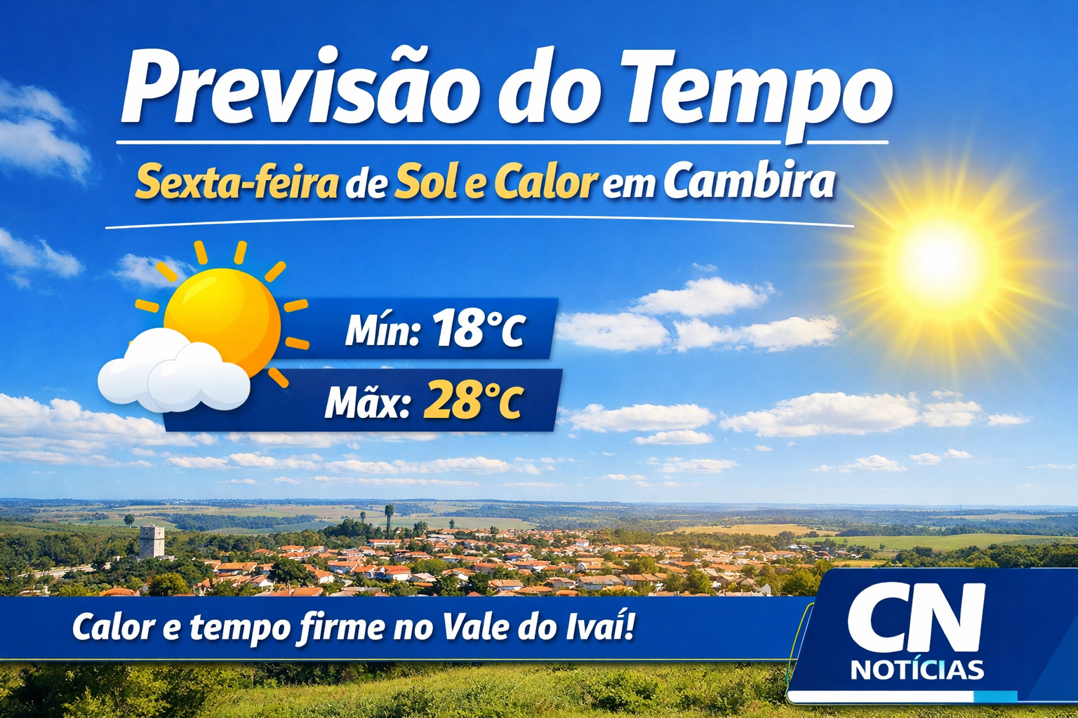A previsão do tempo indica que esta sexta-feira (7) será de tempo firme e predominância de sol em Cambira, no Vale do Ivaí. O dia começa com temperaturas mais amenas durante a madrugada e manhã, mas o calor aumenta ao longo da tarde.