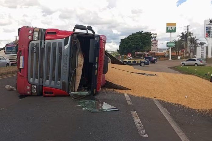 Região: Motorista tomba carreta com 34 toneladas de milho ao tentar fazer desvio
