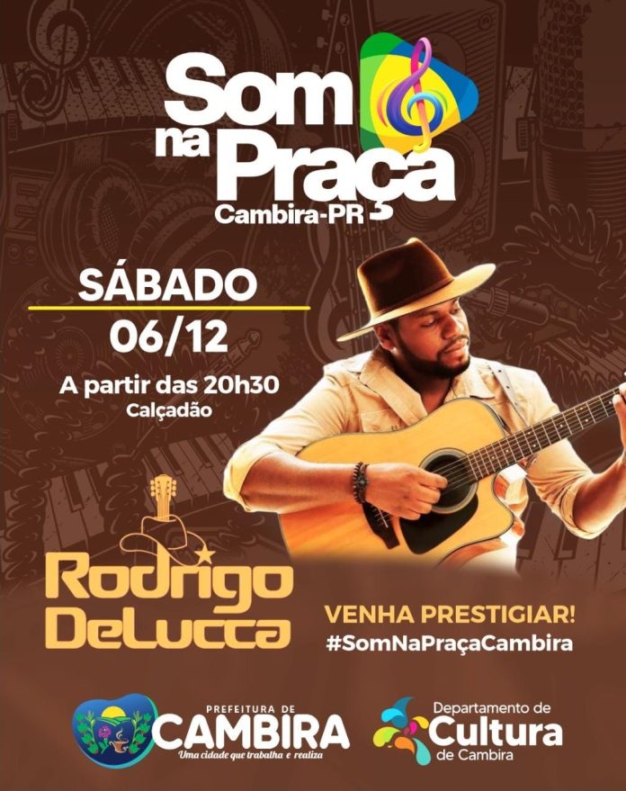 A Prefeitura de Cambira, por meio do Departamento de Cultura, realiza neste sábado, 06 de dezembro, mais uma edição do Som na Praça. O evento acontece no Calçadão, a partir das 20h30, e contará com a apresentação do artista Rodrigo DeLucca, levando música e entretenimento ao público presente.