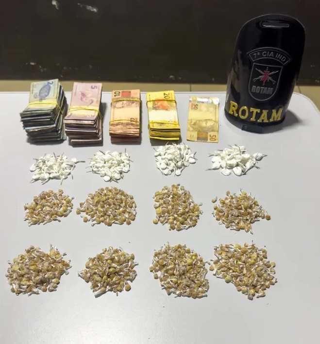 Após o acompanhamento, os policiais retornaram ao ponto onde o objeto havia sido dispensado e localizaram a sacola. No interior do pacote, foi encontrado um verdadeiro “kit” do tráfico de drogas. Além do dinheiro em espécie — dividido principalmente em notas de pequeno valor, como R$ 2,00, R$ 5,00 e R$ 10,00, comumente utilizadas para facilitar o troco na venda de entorpecentes — havia uma grande quantidade de drogas fracionadas e prontas para a venda.