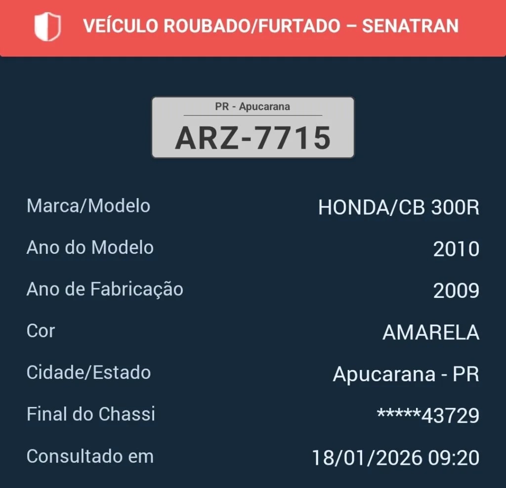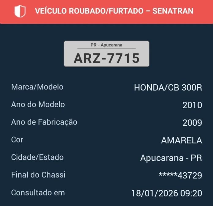 O veículo levado é uma Honda CB 300R, cor dourada, placa ARZ-7715. Após o registro, a equipe realizou patrulhamento nas imediações, porém, até o momento, a motocicleta não havia sido localizada.